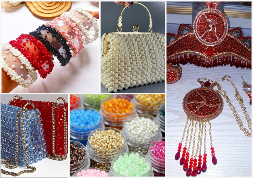Munchoqlarning eng ko‘p qo‘llanadigan turlari bular quyidagilar: 1. Dumaloq munchoqlar. 2. Qisqa tayoqchalar. 3. Bugles, uzun quvurlar. Munchoqlarning boshqa har xil turlari ham bor, lekin bu turdagi munchoqlar gullarni ulash, bog‘lash, shakl hosil qilish uchun ko‘proq qo‘llanadi. Yumaloq, uzun munchoqlarning hammasi shishadan tayyorlanib, ichida igna yurishi uchun yo‘l qoldiriladi. Munchoqlar ichida olmos, dur, swarovski toshlari eng qimmatlari sanaladi. Tikuchilikda ishlatiladigan toshlar ham sifatiga ko‘ra farqlanadi. Bu toshlar asosan Xitoy, Chexiya, Yaponiyada ishlab chiqariladi.