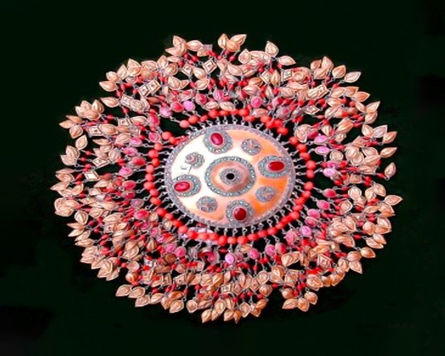 ![]() | Tahya tuzi ayollar boshi bezagi. U gumbazsimon dumaloq kumush plastinkadan iborat. Ustki qismida to‘rtta yoqut, to‘rtta pushti rangli tosh qadalgan, barcha toshlar atrofi feruza bilan o‘ralgan. Butun atrofi bo’ylab marjon va tilla suvi yuritilgan kumush yaproqchalar ulangan. 1 - dona. O’lchami: Og‘irligi - 442,9 gr. |