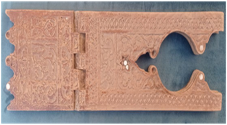 ![]() | Qur’on ottoman. Bir-biriga mahkamlangan kitoblar uchun yog‘och stend, To‘rtburchak ramkalardagi naqshlar orasida arab yozuvida arab yozuvida “Talotan Boydaani Maminka Arabica anna Roydan kof antaturid” degan ko‘rsatmalar bilan “Istasang ilm olasan” degan yozuv bor. 1 - dona. O‘lchami: D - 50 sm, E - 15,2 sm. |