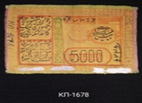 Xorezm 5000 rubl - Mahalliy ipakdan eni 11 sm li tasma to‘qilib, 15 sm uzunlikda kesilgan, keyin esa yog‘och qoliplardan foydalanib, tabiiy bo‘yoqlar yordamida matoga yozuvlar va tasvirlar tushirilgan. Xiva xonligi ipak pullari 200, 250, 500, 1000 va 2500 tanga qiymatida chiqarilgan. 1920-yilda Xorazm Respublikasi tashkil topgach, u ham ipak pullar chiqarishni davom ettirdi. Respublika ipak pullari 500, 1000, 2000 va 5000 rubl qiymatida chiqarilib, ular xonlik pullariga nisbatan ko‘proq tarqalgan. Qizig‘i shundaki, 1923 yilda bu pullarni umumdavlat qog‘oz pullariga almashtirish e’lon qilinganda, aholi birorta ham ipak pulni topshirmagan – ularni esdalik sifatida saqlab qolgan. Hatto 1940–1960-yillarda Xivadagi ayrim xonadonlarda bu ipak pullardan tikilgan quroq ko‘rpalar mavjud bo‘lgan. Bu pullar o‘zining noyobligi va ishlab chiqarish texnologiyasi jihatidan tariximizning nodir ashyosi hisoblanadi. Ipak matodan to‘g‘ri to‘rtburchak shaklida. Old tomonida kulrang naqshli ramka bor. Chap tomonda ikkita qizil ramkada qora, arabcha yozuv bor. O‘rtada quyosh nurlari bilan yarim oy tasvirlangan. Yuqorida arabcha belgilar, pastda oval shaklidagi qizil ramkada qizil rangda “rubl” yozuvi va qora rangda “5000” raqami, o‘ngda qora rangda arabcha belgilar.