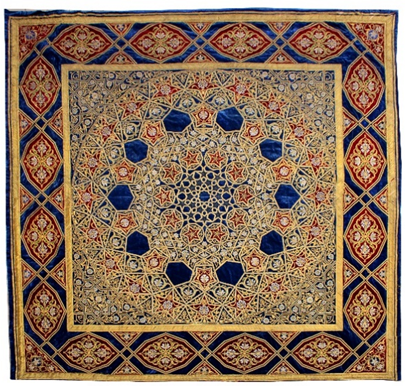 Ko‘k rangli barqutga zar iplar bilan tikilgan noyob panno. Asosi qizil rangli barqutga applikatsiya qilib besh yulduzli murakkab geometrik naqsh tikilgan. Panno markazida bezakdor rozetka va atrofida yulduzlar tikilgan. Kayma-qizil barqutga zar ipdan keng, naqshinkor va gullar naqshlari bilan bezatilgan medalyon tikilgan bo‘lib, atrofi relyefli naqsh bilan qamrab olingan. Buxoro. 1960 yil. Muallifi: V.Stolyarov, M.Ahmedova