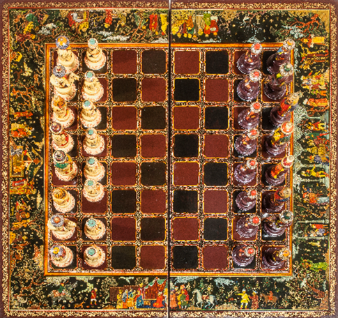 Shaxmat taxtasining markazida qora va jigarrang rangdagi 64 dona kataklar joylashgan bo‘lib, ular islimiy naqshlar bilan bezatilgan. Bu bezaklarda to‘rt xil rang-to‘q sariq, oq, qizil va tillo ranglar ishlatilgan. Shaxmat taxtaning to‘rt cheti bo‘ylab sharqona miniatura syujetlari asosida ishlangan keng friz tasvirlangan. Toshkent. 1983 yil. Muallifi: B.Kudinov